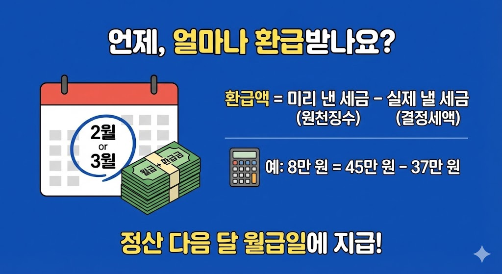 연말정산 환급금은 보통 정산이 끝난 다음 급여 지급일에 함께 돌아옵니다.