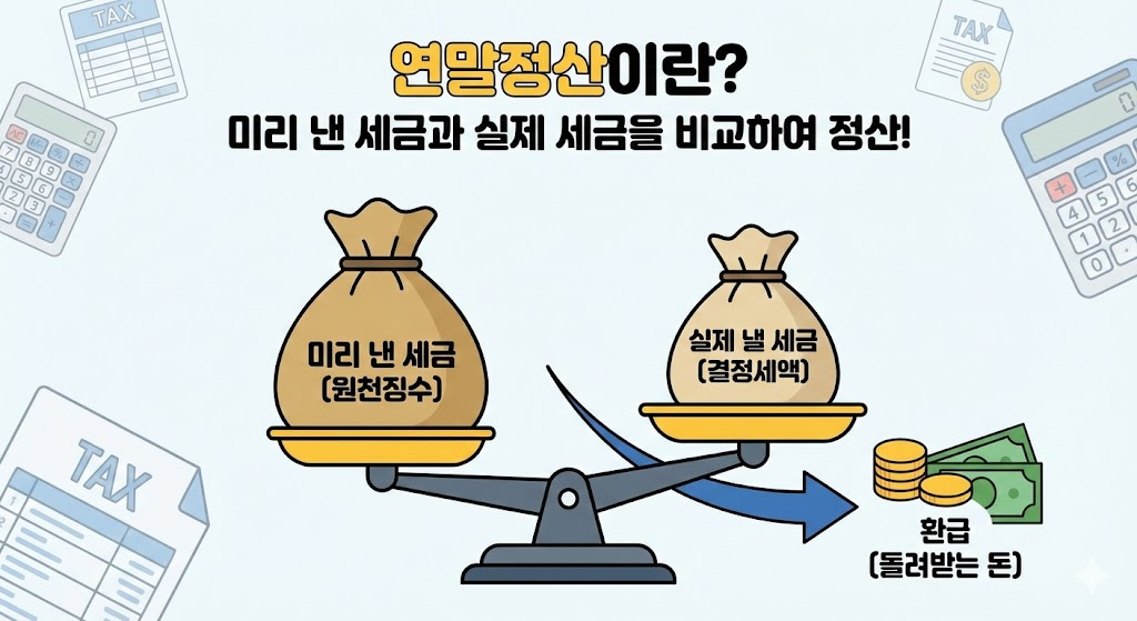 한 해 동안 급여에서 미리 원천징수된 소득세를 정리하는 절차입니다. 월급에서 표준세액공제와 각종 공제 항목을 고려해 미리 세금을 떼는데, 정산 시 실제 세액보다 더 많이 냈으면 환급, 덜 냈으면 추가 납부하게 됩니다.