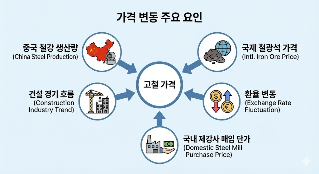 고철 가격은 단순히 국내 수요만으로 정해지지 않습니다. 다음과 같은 요소들이 함께 영향을 줍니다.