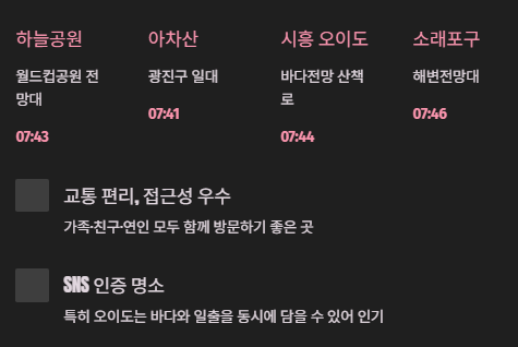 | 함덕 해수욕장 | 약 7:36 | 가족 단위 여행객 추천 |