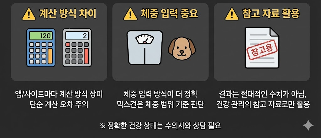 또한 믹스견은 체중 범위를 기준으로 판단하면 된다. 계산 결과는 참고 자료로 활용한다.
