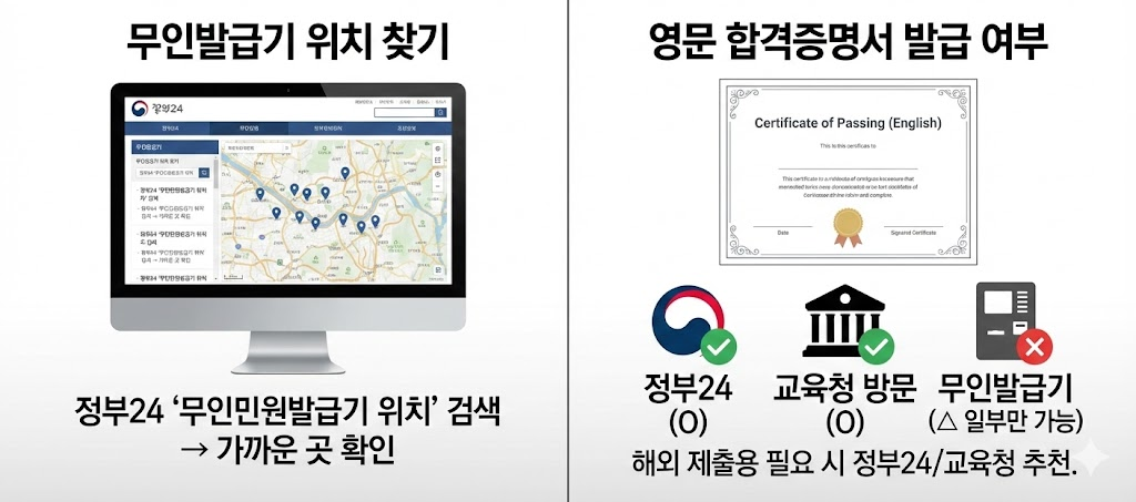 해외 제출용으로 필요한 경우 영문 검정고시 합격증명서도 발급 가능합니다. 다만 일부 무인민원발급기에서는 지원하지 않으므로,