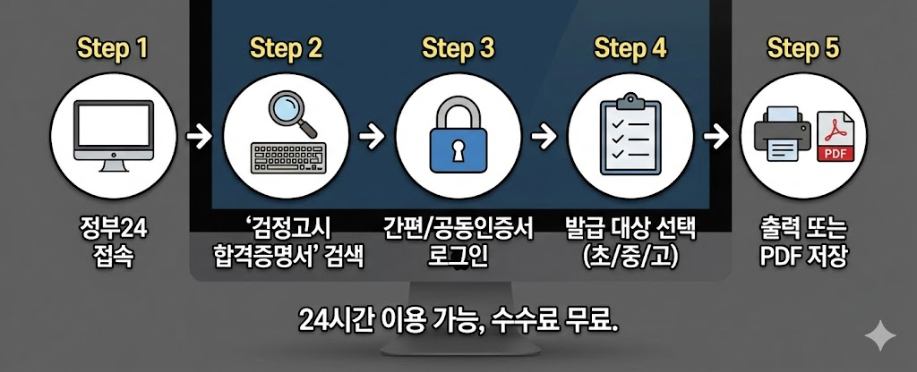 검정고시 합격증명서는 국가에서 인정한 학력 증명 문서입니다. 초등학교, 중학교, 고등학교 검정고시 합격자 모두 발급받을 수 있으며, 각급 학교의 졸업장과 동일한 효력을 가집니다. 이 서류는 취업 서류, 대학 입시, 군 입대, 자격증 시험 등 다양한 행정 절차에서 공식적으로 요구됩니다.