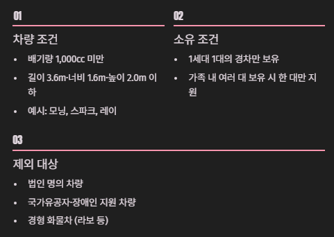 - 가족 구성원이 두 대 이상의 경차를 보유한 경우 한 대만 지원 가능