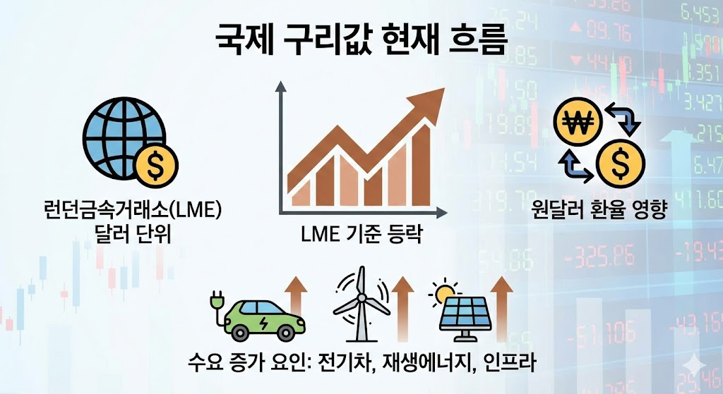 국제 구 리 가격은 런던금속거래소(LME) 기준으로 달러 단위로 거래됩니다.