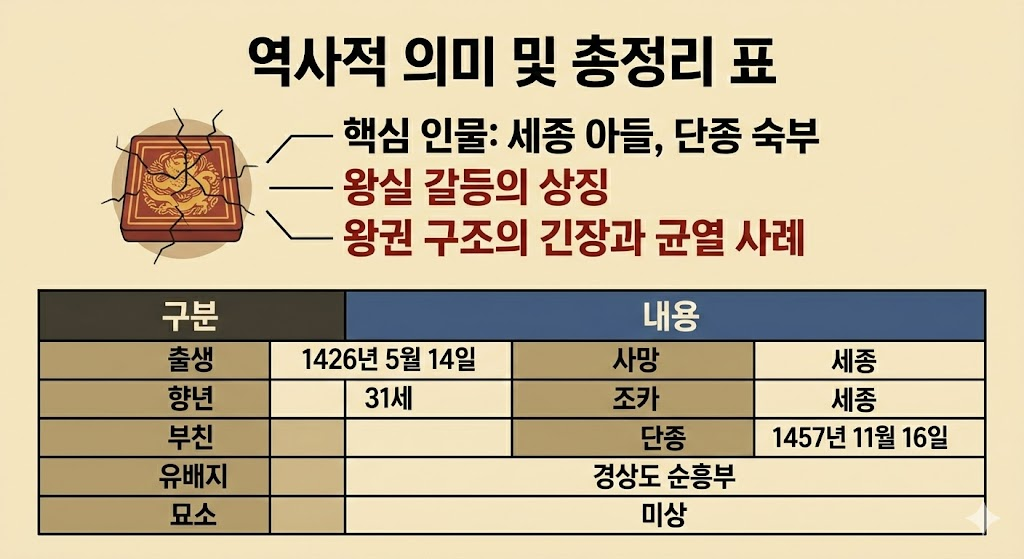 유배지 순흥부와 묘소 미상이라는 기록은 그의 비극적 결말을 상징적으로 보여줍니다.