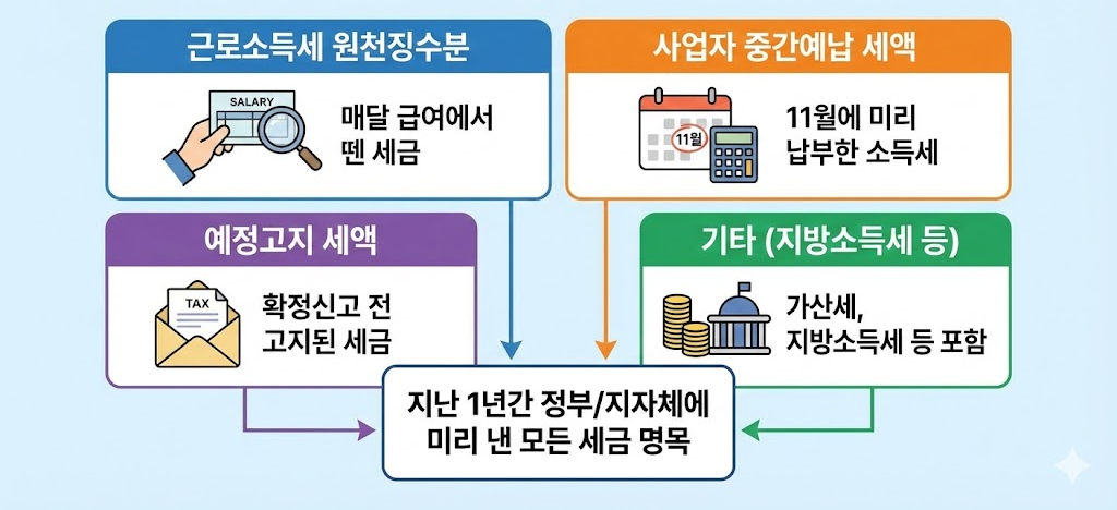 이미 납부한 세금을 말합니다. 말 그대로, 지난 1년 동안 회사에서 급여에서 원천징수로 납부한 세금, 혹은 사업자가 중간예납·예정신고로 낸 세금 등이 여기에 해당됩니다.