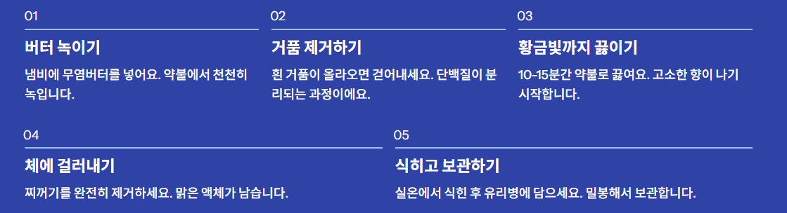 생각보다 만들기가 간단하지만, 불 조절과 찌꺼기 제거 타이밍만 잘 지키면 집에서도 전문가 수준의 고급 버터를 완성할 수 있습니다. 무엇보다 유당이 거의 없고, 풍미가 깊으며 장기 보관이 가능하다는 점이 큰 매력입니다. 조금의 정성과 시간만 투자하면, 식탁 위 건강과 맛을 모두 챙길 수 있는 버터가 완성됩니다.