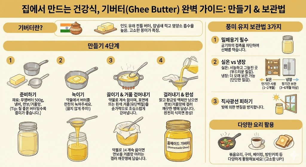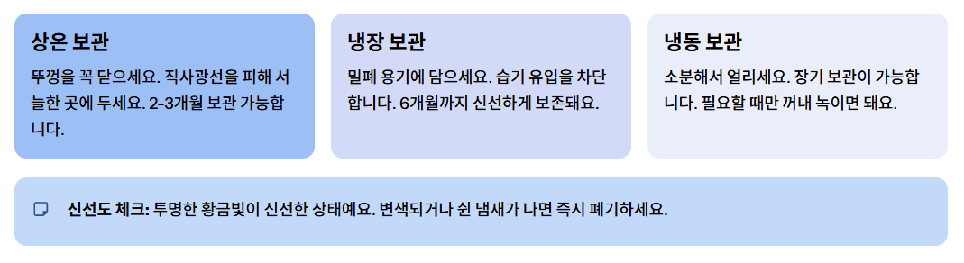 보관 중 변색이나 쉰 냄새가 나면 즉시 폐기하세요. 기 butter 는 향이 강하고 투명한 황금빛을 띨수록 신선한 상태입니다.