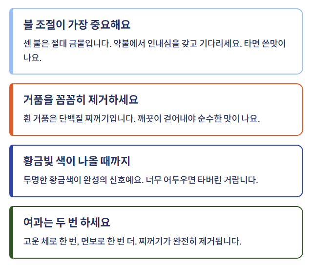 이는 단백질 성분이 분리된 것이므로 숟가락으로 조심스럽게 걷어냅니다. - 황금빛으로 변할 때까지 끓이기