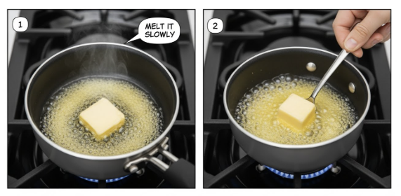 이때 절대 센 불로 가열하지 말고, butter가 서서히 액체로 변할 때까지 기다립니다. - 거품과 찌꺼기 분리하기