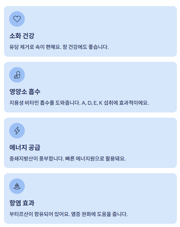 | 피부 보습 | 천연 오일로 사용 가능 (단, 식용 전용 제품은 제외) |