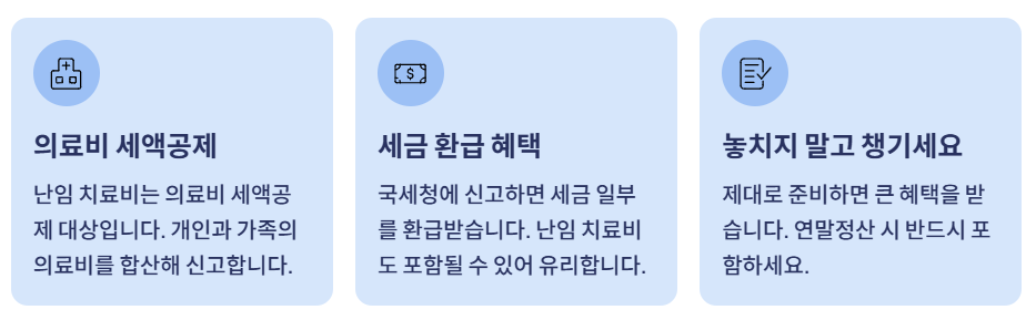 ※ 난임 치료비라도 치료 목적이 분명하지 않은 비용은 대상에서 제외될 수 있습니다. 그리고 모두 병원 발급 영수증이나 납입증명서가 있어야 합니다.