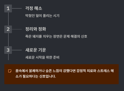 특히 죽은 돼지를 정리하거나 치우는 장면이라면 문제가 해결되고 새로운 기운이 들어올 조짐입니다.
