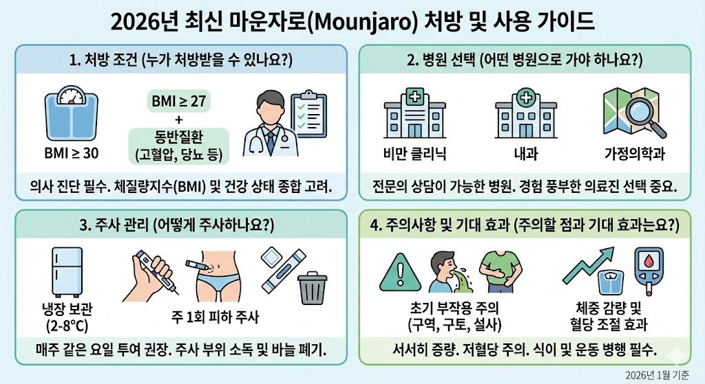 최근 비만 치료와 체중 관리 분야에서 가장 주목받는 약이 바로 마운자로(Mounjaro)입니다. 많은 사람들이 위고비나 오젬픽과 함께 비교하며, “나도 처방받을 수 있을까?”, “어떤 병원에서 가능한가?”에 대한 궁금증을 가지고 있죠. 이 글에서는 마운자로 처방 조건, 병원 선택 요령, 주사 관리법, 주의사항까지 2026년 기준 최신 정보를 정리했습니다.