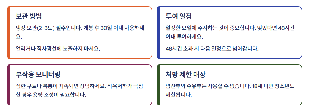 - 냉장 보관(2~8도) 해야 하며, 개봉 후에는 30일 이내 사용 권장.