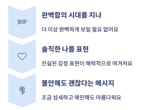 ‘완벽하게 보이려는 시대’를 지나, 이제는 ‘솔직한 나’를 보여주는 것이 더 매력적으로 여겨지죠.