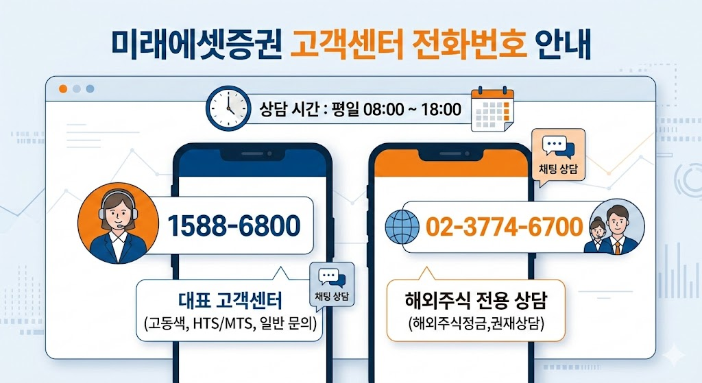 상담 시간은 평일 오전 8시부터 오후 6시까지입니다. 장 시작 직후와 마감 시간에는 문의가 많아 대기 시간이 길어질 수 있습니다. 계좌개설, 비밀번호 오류, HTS·MTS 사용 문의, 해외주식 거래 상담까지 대부분 이 번호로 처리됩니다.