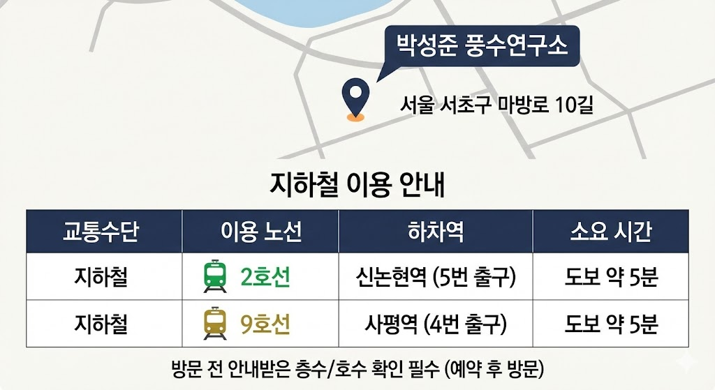 요즘은 사주나 풍수를 단순한 운세 풀이가 아니라 삶의 방향을 잡는 도구로 찾는 사람들이 많습니다. 그중에서도 이름이 자주 언급되는 곳이 바로 박성준 풍수연구소입니다. 정확한 상담력과 현실적인 조언으로 입소문이 나면서, 예약을 잡기 어려운 곳으로 알려져 있습니다. 이번 글에서는 박성준 풍수연구소의 위치, 예약 방법, 상담 가격, 그리고 이용 시 유용한 팁까지 자세히 알려드리겠습니다.