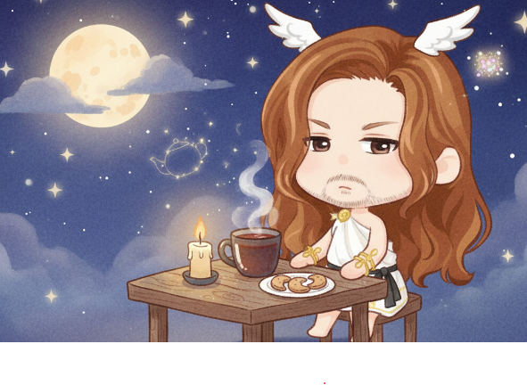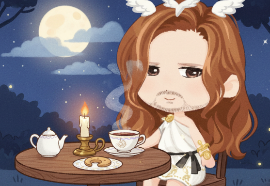 그림 속 캐릭터는 긴 수염과 그윽한 눈, 천사 같은 복장을 하고 있었지만, 동시에 어딘가 어색하고 우스꽝스러운 느낌을 주었죠.