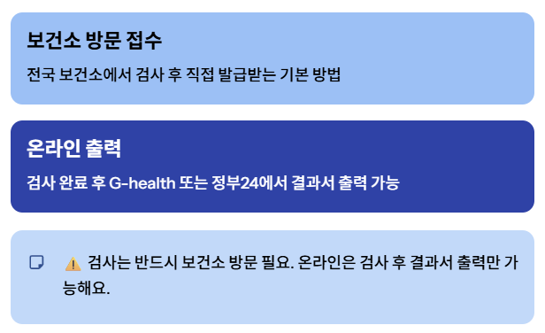 | 온라인 출력 | 검사 완료 후 G-health(건강IN) 또는 정부24에서 출력 가능 |