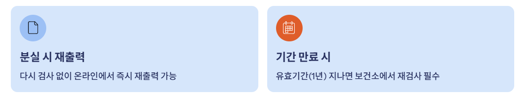 | 재출력 비용 | 무료 (온라인 가능) | 검사일 기준 1년간 유효 |