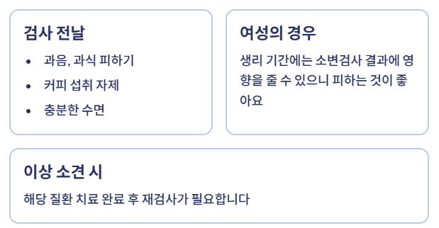 - 여성의 경우 생리 기간에는 소변검사 결과가 영향을 받을 수 있습니다.