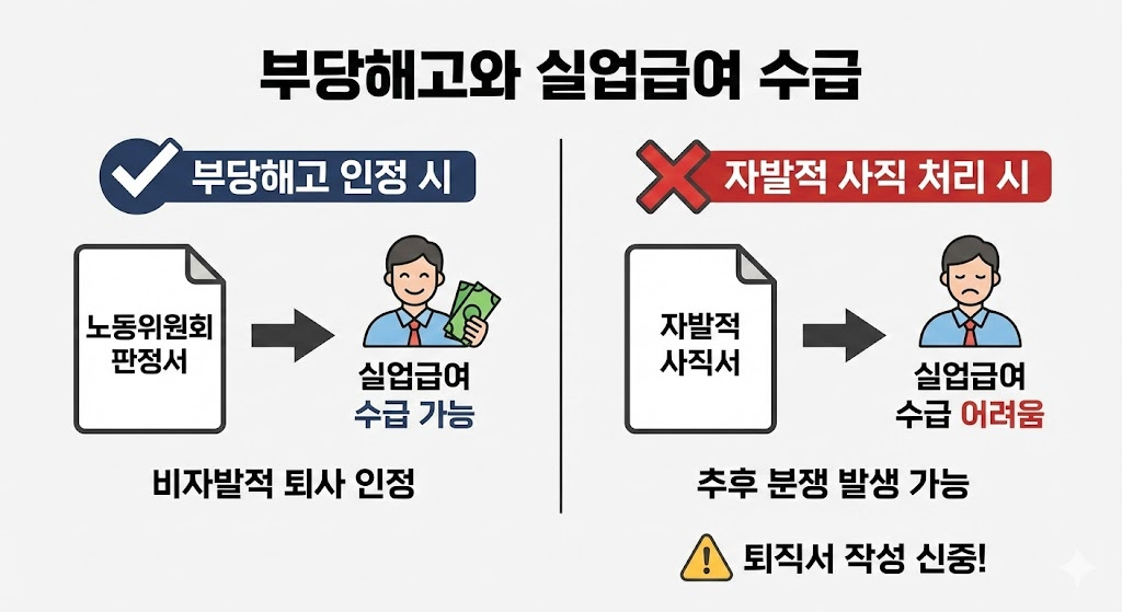 단, 퇴사서를 자발적 사직으로 작성한 경우 문제가 될 수 있습니다. 노동위원회에서 不當解雇 판정이 나오면 해당 판정서를 고용센터에 제출해 수급 절차를 진행할 수 있습니다.