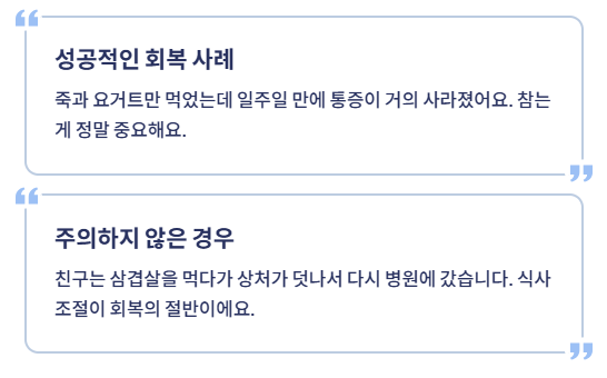 | 자극적인 | 매운 음식, 탄산, 알코올 | 통증 유발, 출혈 위험 |