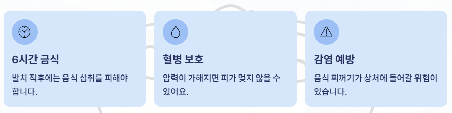 특히 알코올과 담배는 최소 5일 이상 금지하는 것이 좋습니다. 니코틴과 알코올이 상처 치유를 방해하고, 염증 확률을 크게 높이거든요.