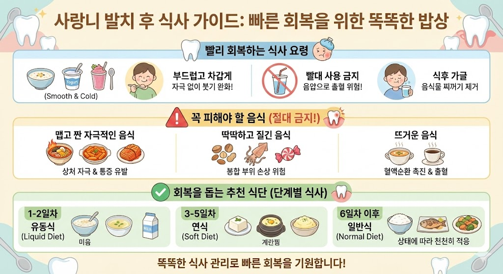 사랑니 발치는 생각보다 간단해 보여도 관리 하나에 따라 회복 속도가 크게 달라집니다. 특히 식사는 치유의 핵심 단계이기 때문에,