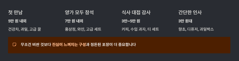 | 간단한 인사 자리 | 3만 원대 | 향초, 디퓨저, 과일박스 |