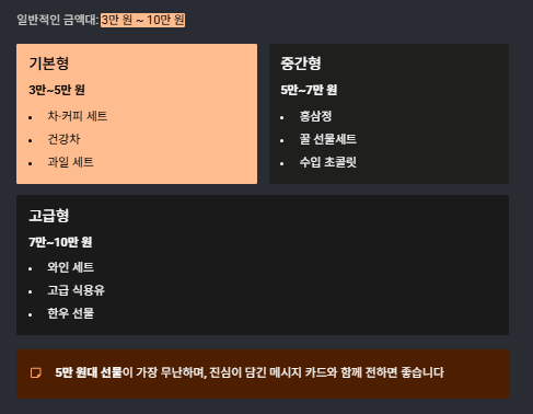 | 기본형 | 3만~5만 원 | 차·커피 세트, 건강차, 과일 세트 |