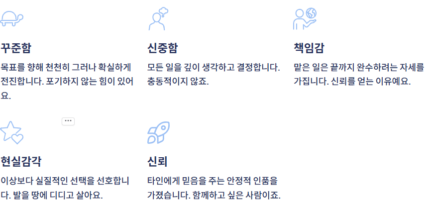 - 대표 성향 : “느리지만 정확하게, 묵묵히 앞으로”