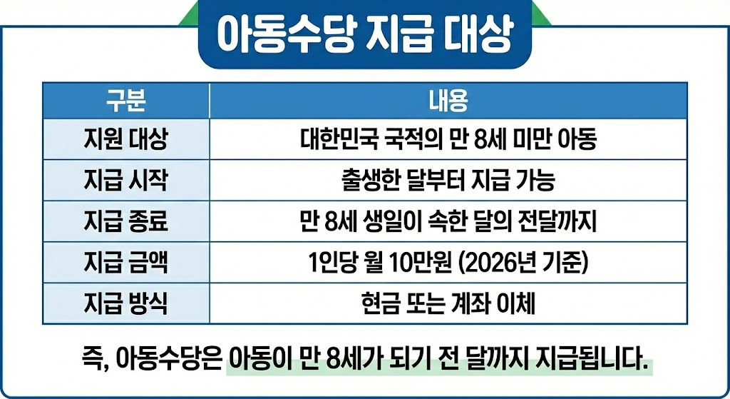 즉, 아동이 만 8세가 되기 전 달까지 지급됩니다. 예를 들어 2018년 3월생 아동이라면, 2026년 2월분까지 수당을 받을 수 있고 2026년 3월부터는 지급이 종료됩니다.