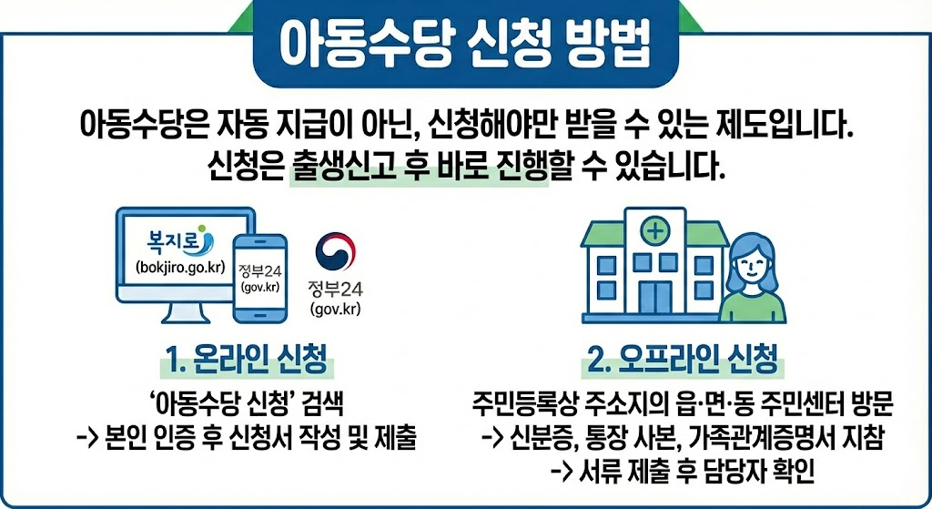 자동 지급이 아닌, 신청해야만 받을 수 있는 제도입니다. 신청은 출생신고 후 바로 진행할 수 있습니다.