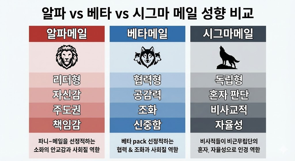 집단 중심적 리더형이며, 베타메일은 협력 중심의 안정형, 시그마메일은 독립적인 개인형으로 볼 수 있습니다.