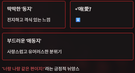 | 애동지 | 같은 생각을 공유하는 사람 | 친근하고 유쾌함 |