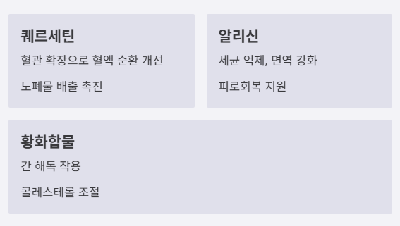 | 황화합물 | 간 해독 작용, 콜레스테롤 조절 |
