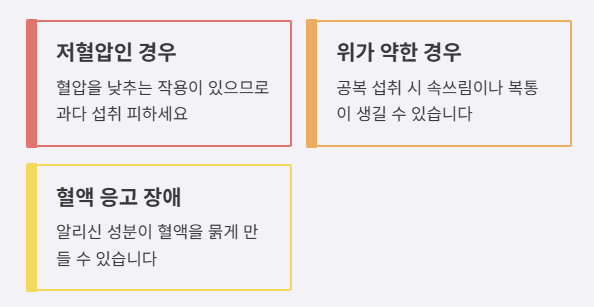 • 저혈압인 경우 : 혈압을 낮추는 작용이 있으므로 과다 섭취는 피하세요.
