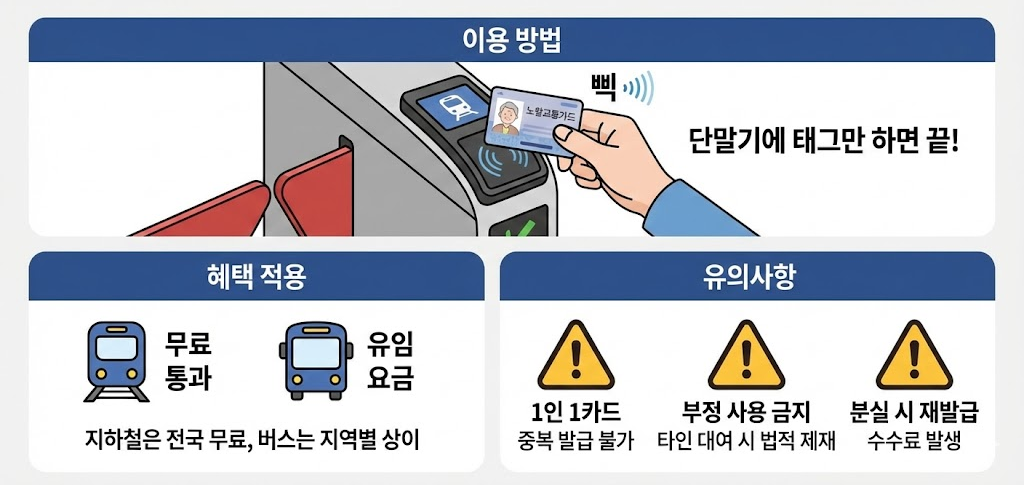어르신 교통카드는 전국 주요 지하철 및 도시철도 무료 이용이 기본 혜택입니다. 특히 수도권, 부산, 대구, 광주 등 대부분 도시철도에서 동일하게 적용됩니다.