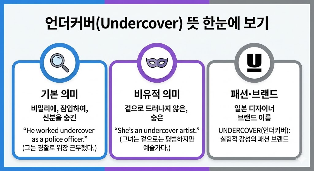 요즘 영화나 드라마, 패션 브랜드 이름에서 자주 들을 수 있는 단어가 있습니다. 바로 ‘언더커버(Undercover)’입니다. 한 단어지만 상황에 따라 전혀 다른 의미로 쓰이기 때문에 정확히 알아두면 영어 표현력뿐만 아니라 뉴스나 문화 콘텐츠를 이해하는 데도 도움이 됩니다.
