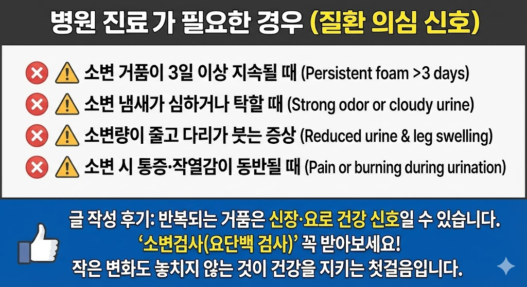 단순히 물을 적게 마셔서 생기는 일시적 현상일 수도 있지만, 지속된다면 신장이나 요로 건강에 문제가 생겼다는 신호일 가능성이 있습니다. 특히 반복적으로 나타난다면 병원에서 소변검사(요단백 검사)를 꼭 받아야 합니다. 몸이 보내는 작은 변화를 무시하지 말고, 생활습관부터 점검해보는 것이 건강을 지키는 첫걸음입니다.