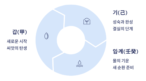 - 임(壬)과 계(癸)는 물의 기운, 새로운 순환의 준비