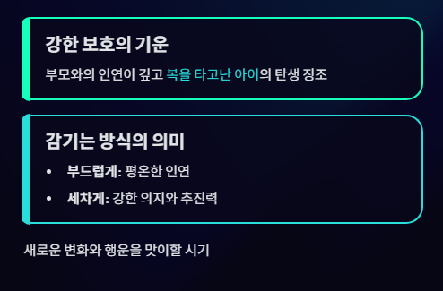 태몽으로 보면 부모와의 인연이 깊고 복을 타고난 아이가 태어날 징조로 풀이됩니다.