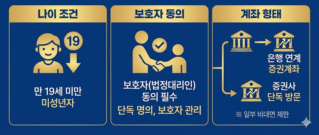 자녀 주식계좌 개설은 만 19세 미만이면 미성년자 계좌로 진행한다. 보호자 동의가 필수다. 단독 명의 계좌이지만 법정대리인이 관리한다.
