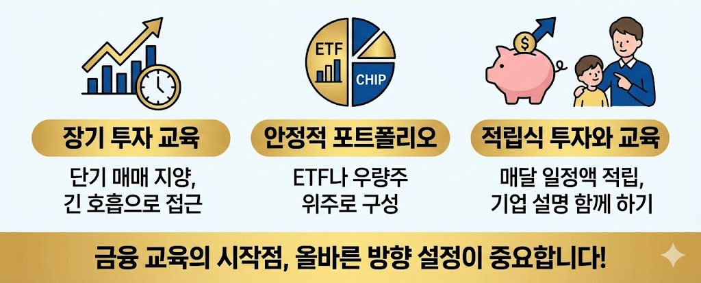 단기 매매보다는 장기 투자 교육 목적이 적합하다. ETF나 우량주 중심으로 접근하는 방식이 안정적이다.