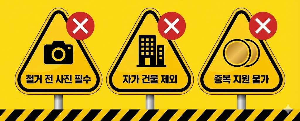 철거를 먼저 진행하고 나중에 신청하면 대상이 되지 않는 경우도 있으니 공고 조건을 미리 확인해야 합니다.