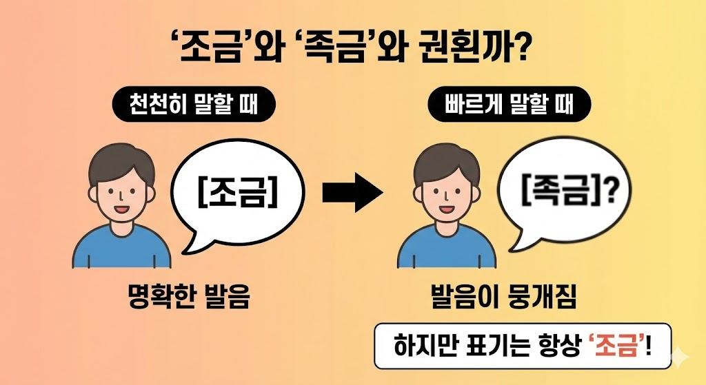 말을 빠르게 하면 “조금”이 “족금”처럼 들릴 수 있다. 특히 어린 시절 발음이 완전히 자리 잡지 않았을 때 이런 혼동이 생긴다.