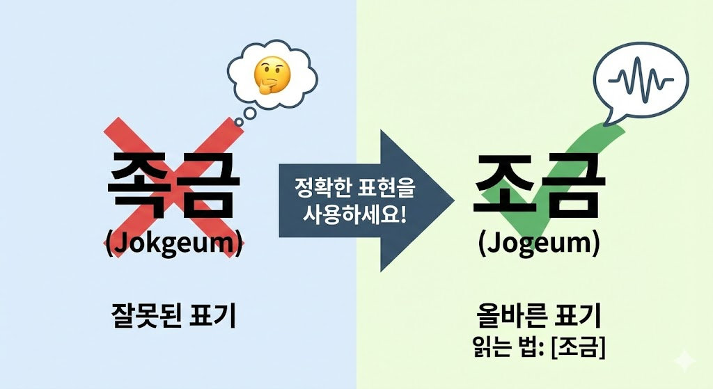 정답은 ‘조금’이다. 발음도 그대로 “조금”이다. ‘족금’은 잘못된 표현이다. 작은 맞춤법 하나지만 정확하게 알고 쓰면 글의 신뢰도가 높아진다. 평소 자주 쓰는 단어일수록 정확한 표기가 중요하다.